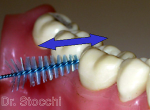 In alternativa al filo interdentale, se gli spazi tra i denti sono ampi, si può utilizzare lo scovolino che va inserito orizzontalmente tra i denti e la gengiva, al di sotto del punto di contatto. Con lo scovolino non usare il dentifricio, altrimenti si rischiano usure della radice.